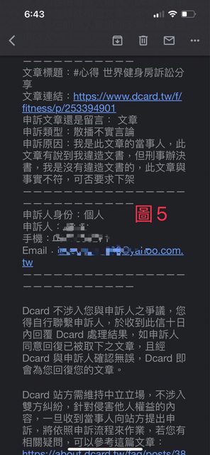 : 事後我po文Dcard分享這次訴訟經驗,對方還檢舉我的文章(圖5),犯錯不會認,被打