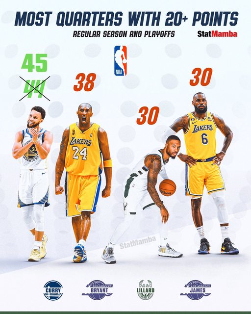 這是Curry第45次單節得分20+,包含例行賽與季後賽。 排名在後的有:Kobe 38次、小李和老詹30次 第四節獨得22分,也是本季第四高,但如果不算罰球,就是本季最高的第四節得分 http://i.imgur.com/thoDI35.jpg