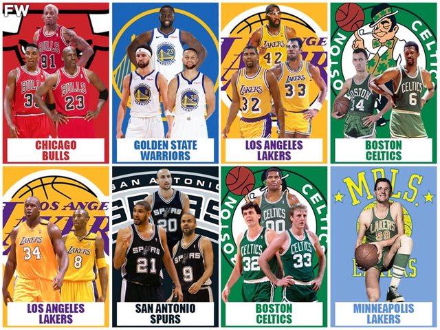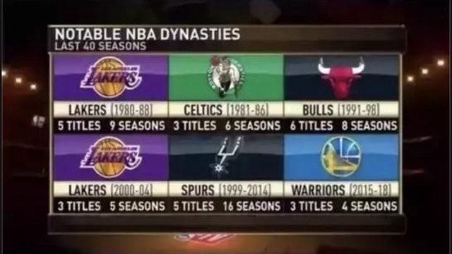1980~88湖人:九季內五冠 1981~86塞爾提克:六季內三冠 1991~98公牛:八季內六冠 2000~02湖人:三連霸 2003~07馬刺:五季內三冠 2015~18勇士:四季內三冠 當然,根據這個規律 1950年代湖人與1960年代塞爾提克 自然而然亦是王朝 https://i.imgur.com/liC6t0K.jpeg