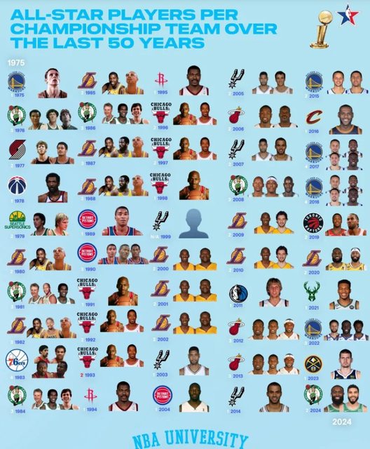 近50年冠軍球隊全明星球員數量:99馬刺0人,三隊4人入選 今日,數據媒體NBA University總結了過去50年的冠軍球隊陣容中賽季全明星球員的數量 情況。 無人入選全明星的冠軍球隊(1支):1999年馬刺。 有一位全明星球員的冠軍球隊(14支):1975年勇士、1978年巫師、1989年活塞、1991年 公牛、1994年火箭、1995年火箭、1998年公牛、2003年馬刺、2004年活塞、2011年獨行俠 、2014年馬刺、2016年騎士、2021年公鹿、2023年金塊。 有兩位全明星球員的冠軍球隊(20支):1977年拓荒者、1979年超音速、1980年湖人、 1985年湖人、1992年公牛、1993年公牛、1996年公牛、1997年公牛、2000年湖人、2001年 湖人、2002年湖人、2005年馬刺、2006年熱火、2007年馬刺、2009年湖人、2010年湖人、 2015年勇士、2019年暴龍、2020年湖人、2024年塞爾提克。 有三位全明星球員的冠軍球隊(12支):1976年塞爾提克、1981年塞爾提克、1982年湖人 、1984年塞爾提克、1986年塞爾提克、1987年湖人、1988年湖人、1990年活塞、2008年塞 爾提克、2012年熱火、2013年熱火、2022年勇士。 有四位全明星球員的冠軍球隊(3支):1983年76人、2017年勇士、2018年勇士。 https://i.imgur.com/OBrp5Gr.jpeg