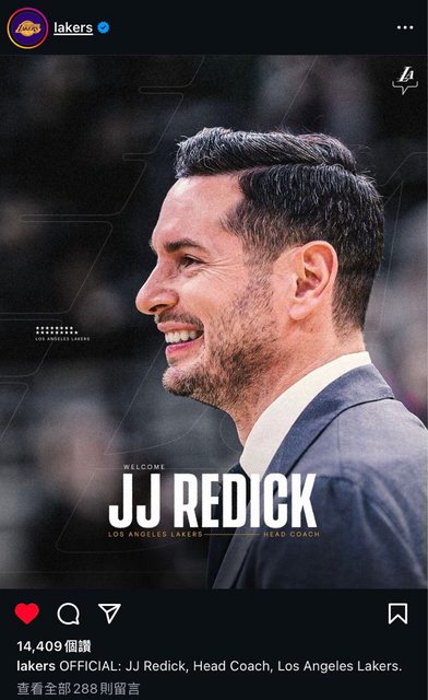 消息來源:湖人instagram (https://www.instagram.com/p/C8nFTAzyvJ_/?igsh=eDVna3U 5N3hqb200) 內容:lakers OFFICIAL: JJ Redick, Head Coach, Los Angeles Lakers 短評或心得:太神辣紅屌,人生第一次當教練就是湖人總教練,祝福恭喜,希望明年湖人 至少可以過季後賽第一輪。 https://i.imgur.com/PC0ESqA.jpeg