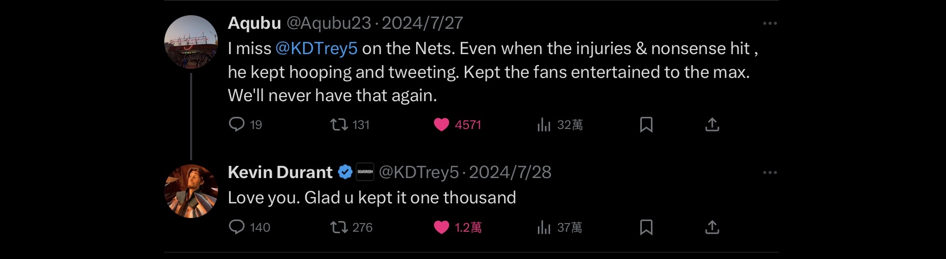 推 h5t6566556 : 之前有籃網球迷發推懷念有KD的日子,KD本人有親自回 08/21 13:23