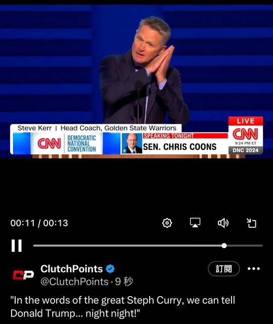 : 內容:Kerr在民主黨造勢大會引用Curry經典晚安手勢要川普洗洗睡