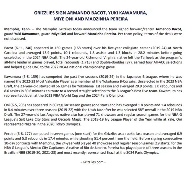 香港時間9月7日,灰熊官方宣佈,球隊正式簽下河村永輝、阿馬多-巴科、米耶-奧尼和毛