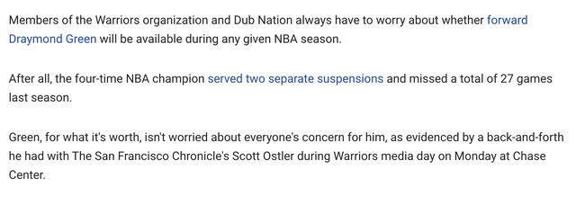 勇士隊成員和勇迷總是要擔心Draymond是否會缺賽,因為他去年就被禁賽2次共缺席27場