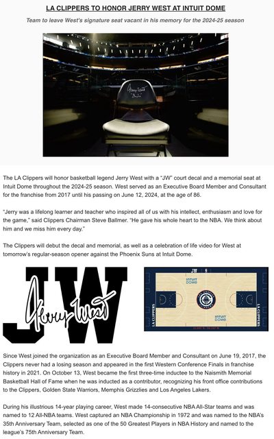 洛杉磯快艇將會在開幕戰紀念Jerry West並整季在Intuit Dome場邊印上"JW"字樣以及擺放