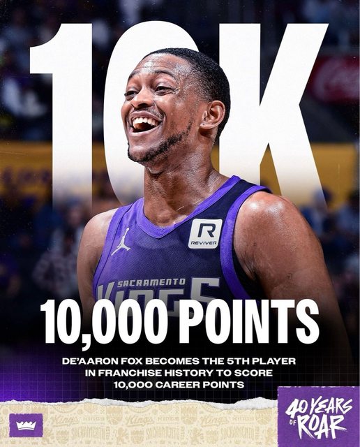 國王隊主將De’Aaron Fox日前剛達成生涯700顆三分球, 今天稍早在對陣拓荒者隊的比賽也達成生涯第10000分,是2017梯第三位達成此里程碑的 球員,前兩位為Jayson Tatum和Donovan Mitchell。 -- ※ 發信站: 批踢踢實業坊(www.ptt.org.tw), 來自: 39.12.1.25 (臺灣) ※ 文章網址: https://www.ptt.org.tw/NBA/M.1730174358.A.F89
