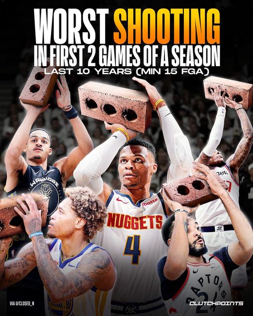 Worst field goal percentage through the first two games of an NBA season in th e last 10 years (min. 15 FGA): *Russell Westbrook 2-of-18 (11.1%) Marc Gasol 2-of-17 (11.8%) Norman Powell 2-of-16 (12.5%) Jordan Poole 3-of-22 (13.6%) Mike Conley 4-of-27 (14.8%) Nickeil Alexander-Walker 3-of-19 (15.8%) Kelly Oubre Jr. 4-of-24 (16.7%) Austin Rivers 3-of-18 (16.7%) Norman Powell 3-of-18 (16.7%) *Kevin Porter Jr. 3-of-18 (16.7%) *This season ——— 過去十年中,在 NBA 賽季的前兩場比賽中,某些球員的投籃命中率表現相對低迷。 (出手15次以上) ——— 蠻意外砲竟然在榜單中出現了兩次 然後今年快艇簽來的KPJ真的慘不忍睹 連基本的幹分也沒辦法...... 最後該不會又要來一次「 」集合了吧? -- ※ 發信站: 批踢踢實業坊(www.ptt.org.tw), 來自: 111.82.45.248 (臺灣) ※ 文章網址: https://www.ptt.org.tw/NBA/M.1730229708.A.130