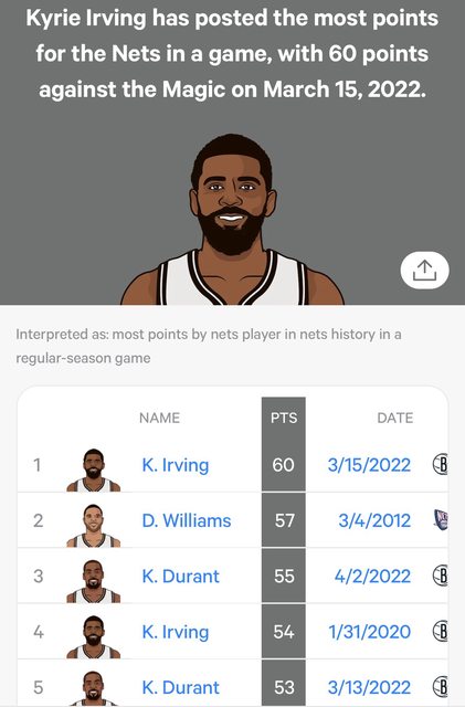 1. K. Irving:60(3/15/2022)