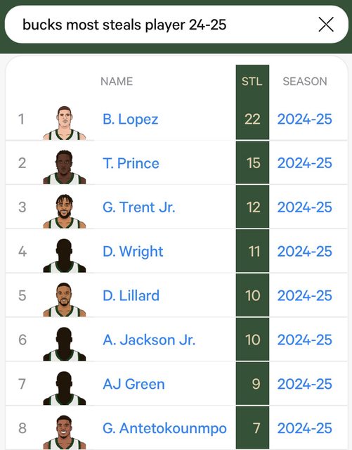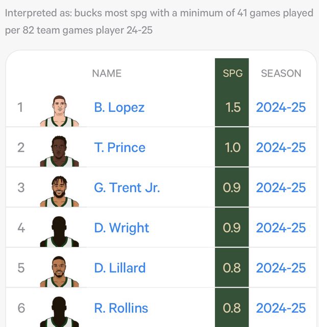 其他公鹿球員場均抄截次數均低於1(Antetokounmpo-0.5、Lillard-0.8)