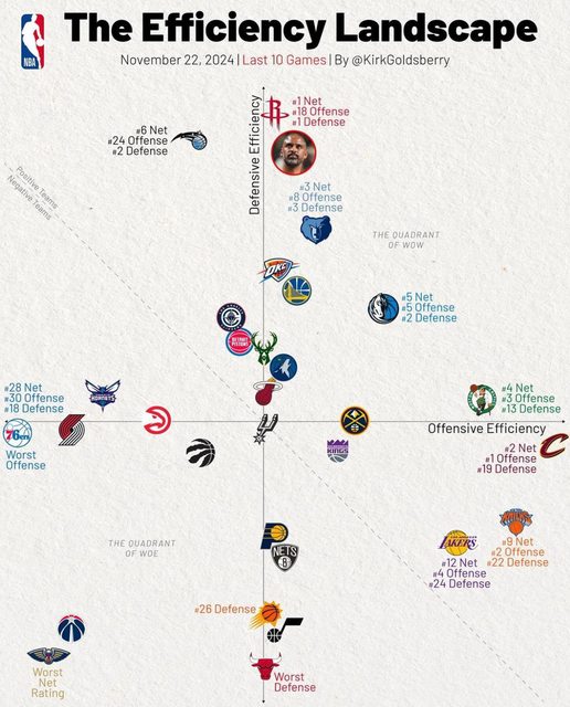 The Efficiency Landscape. What Jumps Out? 10 Free Takes 1. HOU is very good 2. PHL is very bad 3. LAL and NYK are very good... 4. ... at offense 5. MEM looking good 6. DAL too, but can they win without 77? 7. MIL is finally above water 8. PHX is not 9. GSW still cruising 10. BOS too 1.火箭非常讚 2.七六人非常糟糕 3.湖人跟尼克非常讚….. 4…..但僅限進攻 5.灰熊狀態不錯 6.獨行俠狀態也不錯,但他們少了77還能贏嗎 7.公鹿終於浮出水面 8.但太陽還沒 9.勇士依然穩定強 10.綠賽也是 心得:魔術不是孤單在上面了,火箭升空去陪他們了。跟上次相比太陽應該是掉的最多的。 -- ※ 發信站: 批踢踢實業坊(www.ptt.org.tw), 來自: 111.248.20.205 (臺灣) ※ 文章網址: https://www.ptt.org.tw/NBA/M.1732292557.A.780