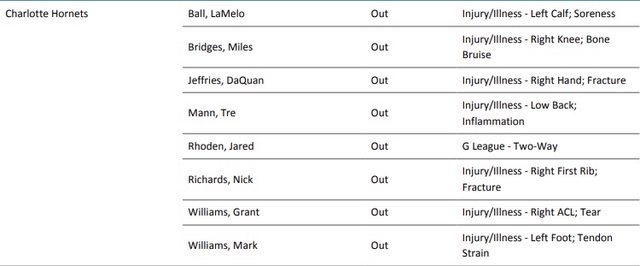 The Hornets are down EIGHT players for tomorrow's game against the New York Kn icks, including 5 of their top 6 scorers LaMelo Ball — OUT Miles Bridges — OUT Tre Mann — OUT Grant Williams — OUT Mark Williams — OUT Nick Richards — OUT Jared Rhoden — OUT DaQuan Jeffries — OUT ——— 黃蜂隊明天對決紐約尼克隊的比賽中將缺少八名球員,其中包括六大得分手中的五位。 LaMelo Ball:左小腿酸痛 Miles Bridges :右膝骨頭挫傷 DaQuan Jeffries :右手骨折 Tre Mann:下背部發炎 Jared Rhoden:發展聯盟 - 雙向合約 Nick Richards:右側第一肋骨骨折 Grant Williams:右膝前十字韌帶撕裂 Mark Williams:左腳肌腱拉傷 -- ※ 發信站: 批踢踢實業坊(www.ptt.org.tw), 來自: 223.141.54.154 (臺灣) ※ 文章網址: https://www.ptt.org.tw/NBA/M.1732836599.A.61F
