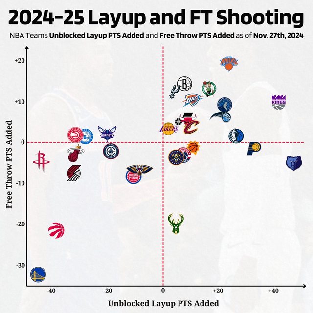 https://x.com/automaticnba/status/1862221282256834907?s=46 Layups and Free Throws, the two easiest shots in basketball. Here's how well tea ms have done each so far this season. 越右邊代表上籃終結的能力越好,反之則越差 越上面代表罰球越好,反之則越差 https://i.imgur.com/KsMt2EM.jpg