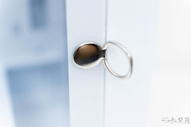 玻璃側板為開門轉軸式,金屬扣環拉開作為施力點打開側板