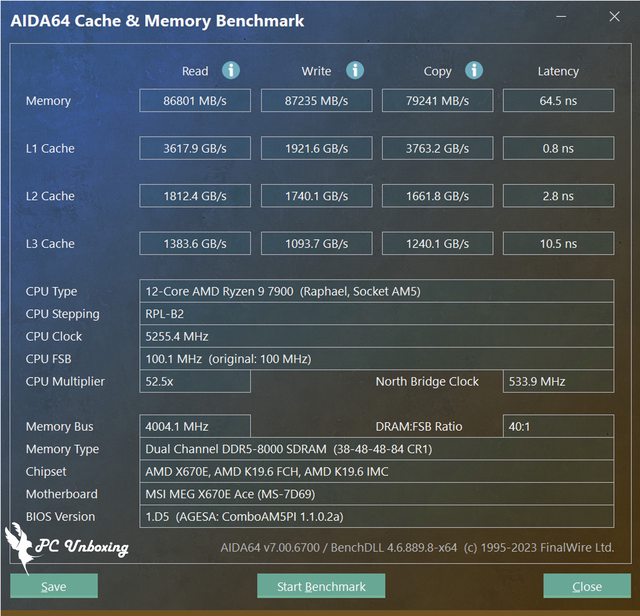 86801 MB/s 跟 87235 MB/s,延遲為 64.5 ns,AMD 平台能以 8000 MT/s 直接開機測試