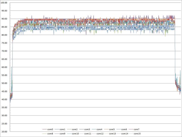 ▼高負載30分鐘CORE TEMP溫度記錄圖