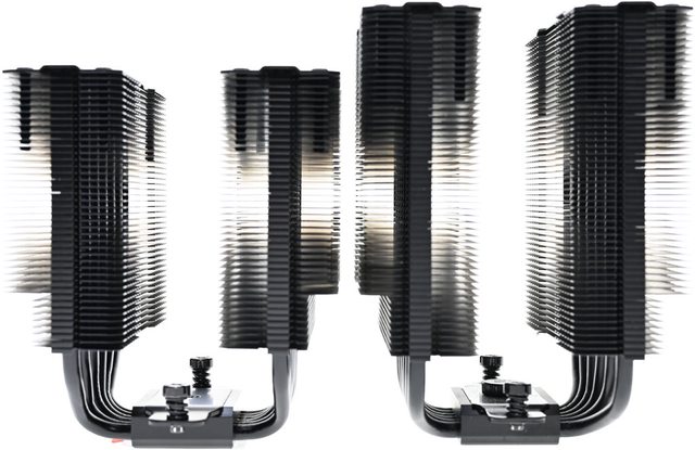 ▼散熱器本體採雙塔設計,熱導管及鰭片採黑化處理,底座兩邊各伸出6支直徑6mm無重力