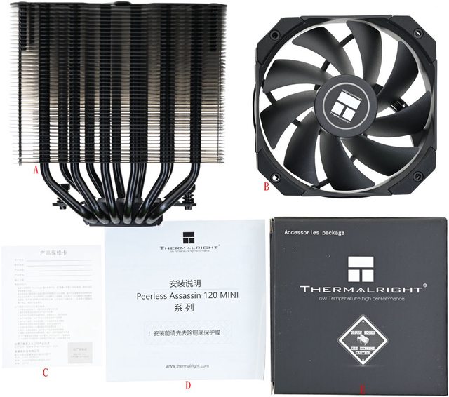 ▼包裝內容有散熱器(A)、TL-D12B風扇(B)、保證卡(C)、安裝說明書(D)、安裝配件盒(E)
