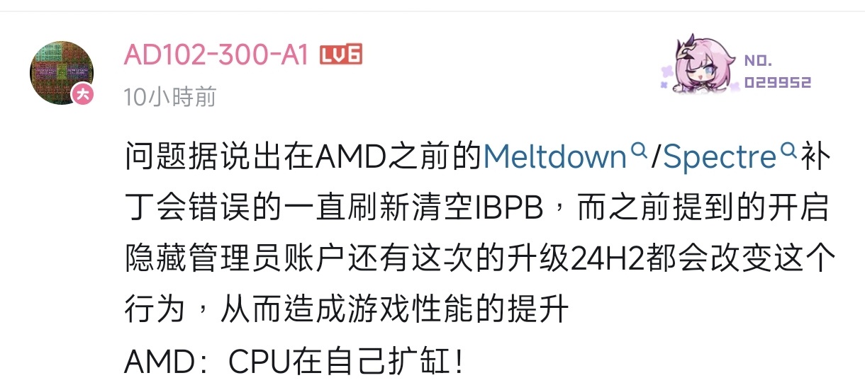 → AIRURU: 看對岸留言說是AMD之前修分支預測的漏洞搞 27.52.161.47 08/27 14:01
