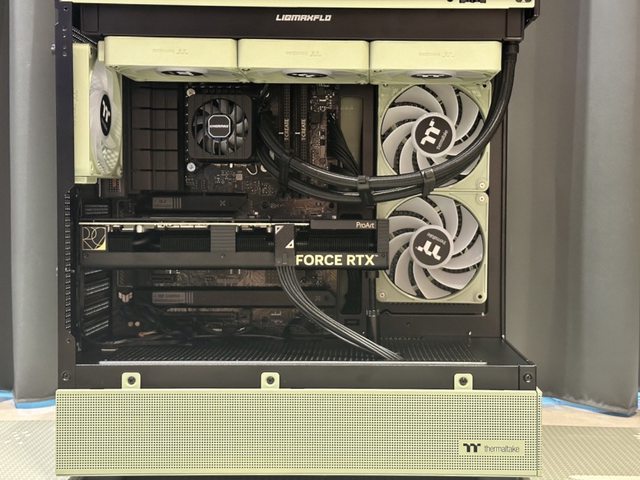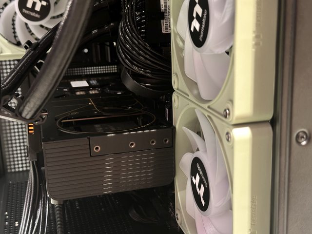 顯示卡剛好跨過側邊風扇,如側邊要搭配水冷只能使用雙風扇短卡,且建議側邊僅安裝