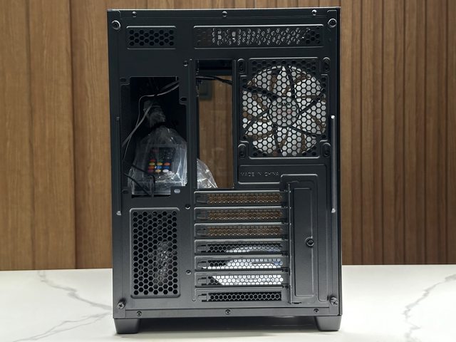 採用雙艙結構及電源在上、硬碟架在下方的配置,後排風能安裝120mm風扇,設有7個PCI