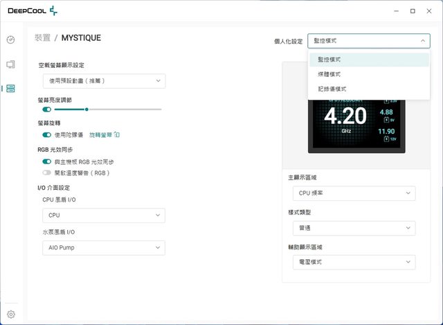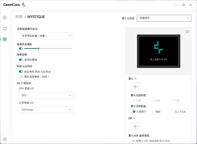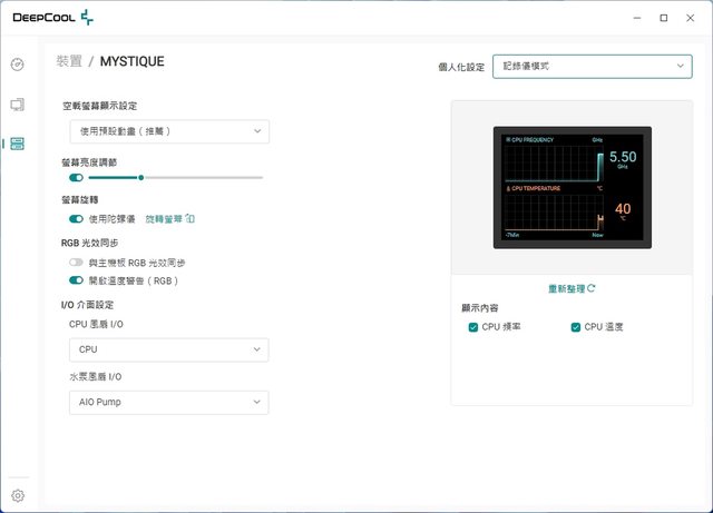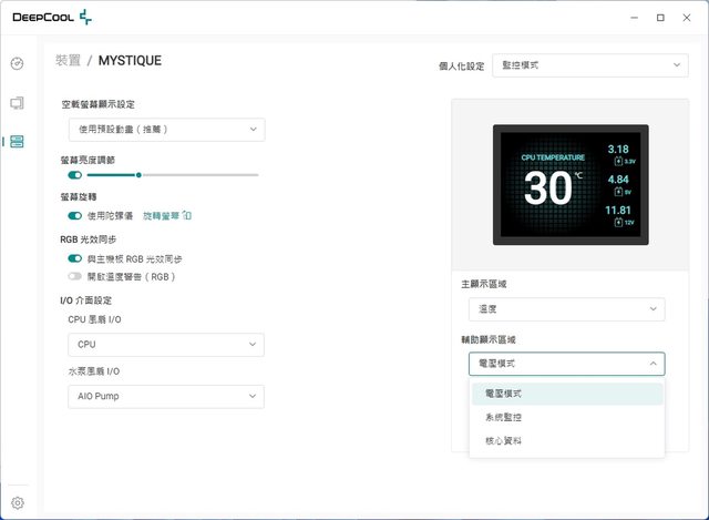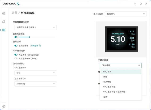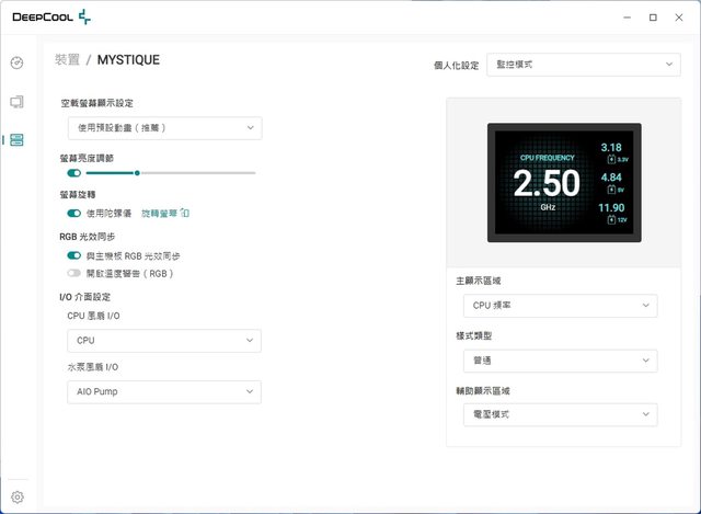 在水冷裝置的頁面能調整冷頭螢幕的相關設定。
