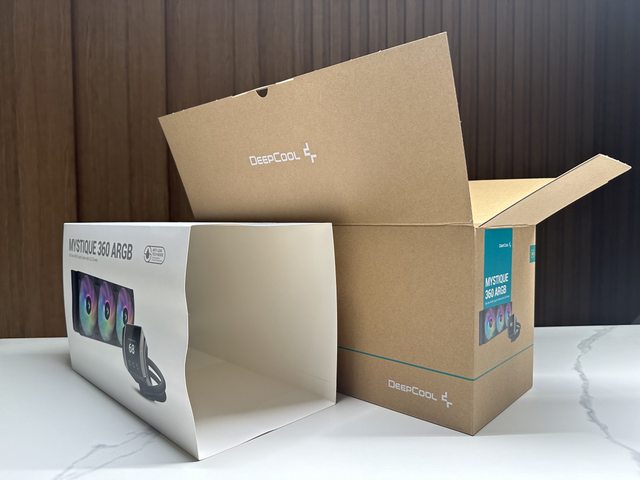 包裝採用九州常用的牛皮紙色箱體加上彩色"書腰"方式,正面為MYSTIQUE 360 ARGB產品