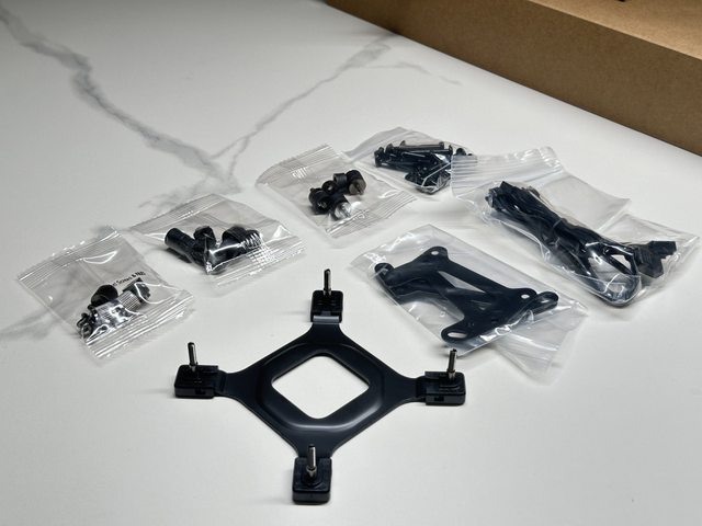 配件包括intel平台金屬背板、各平台扣具及菊鍊電源+ARGB二合一線材。