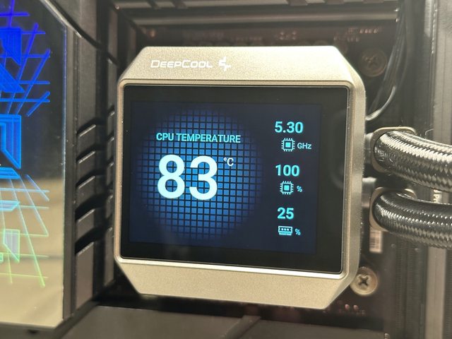 測試時螢幕顯示溫度為83度,應該是擷取Package的讀數,如果將螢幕旁的RGB燈帶設定成
