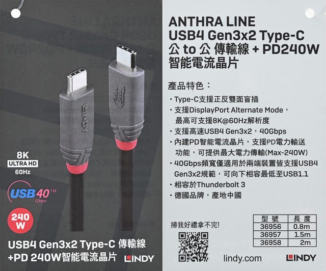 標題[開箱] LINDY ANTHRA LINE USB4 Gen3×2 240W線