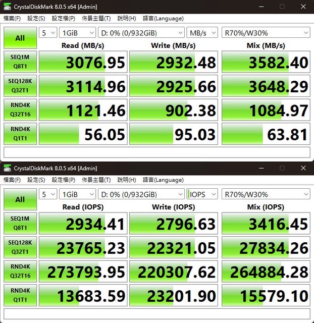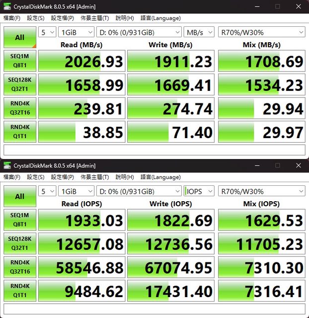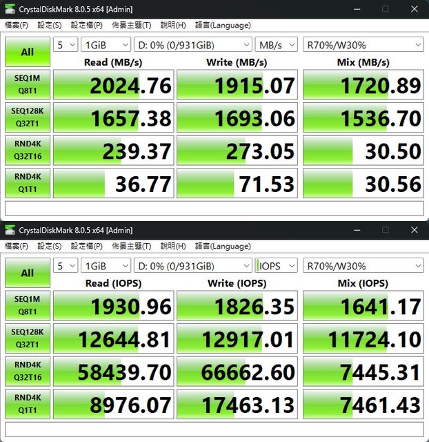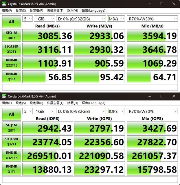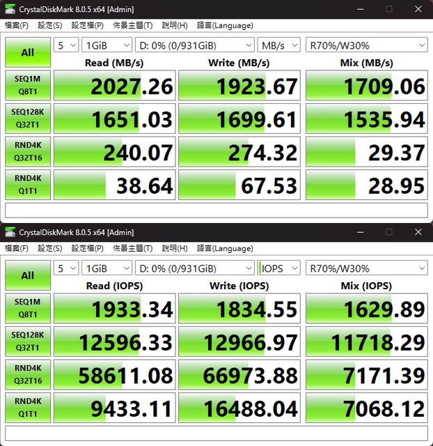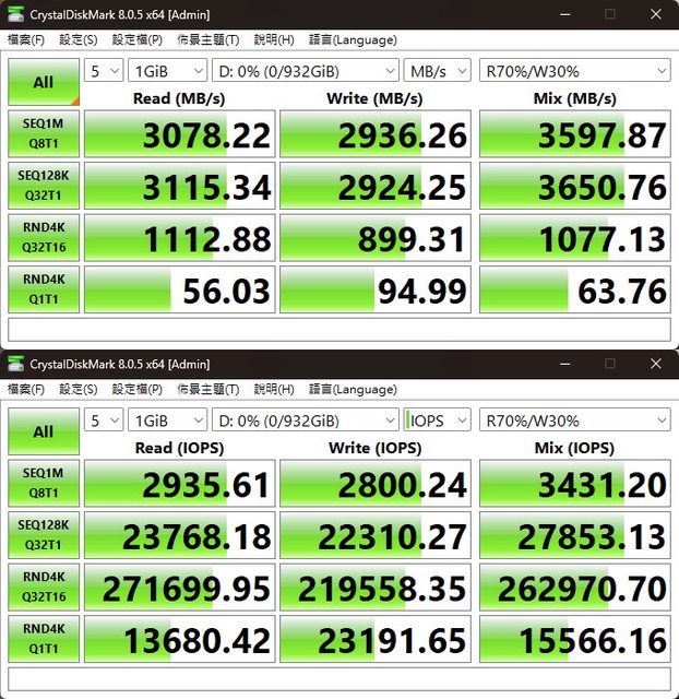 ▼CrystalDiskMark預設+R70%/W30% Mix測試