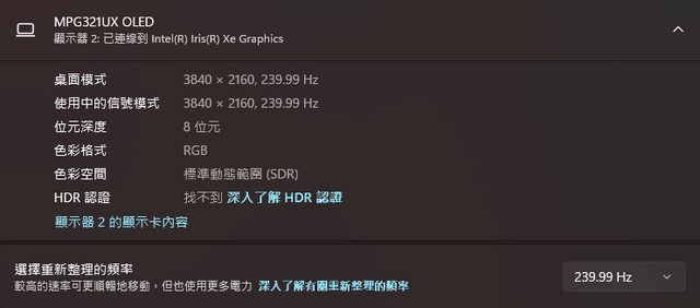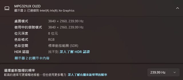 ▼進階顯示設定的顯示器內容資訊,可使用3840×2160@240Hz信號模式