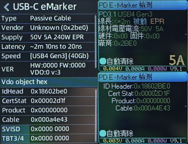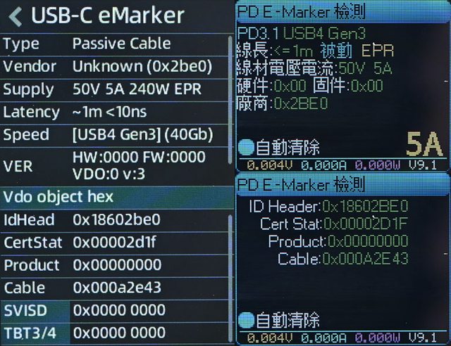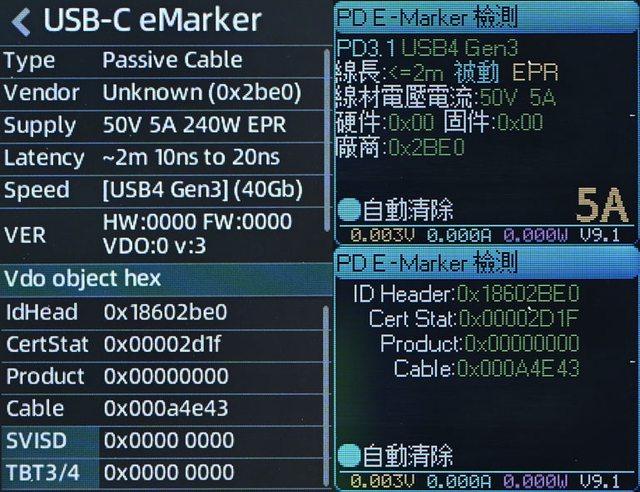 ▼2m(36958)的E-Marker資訊內容,支援USB4 Gen3 40Gbps資料傳輸及50V/5A 240W EPR電