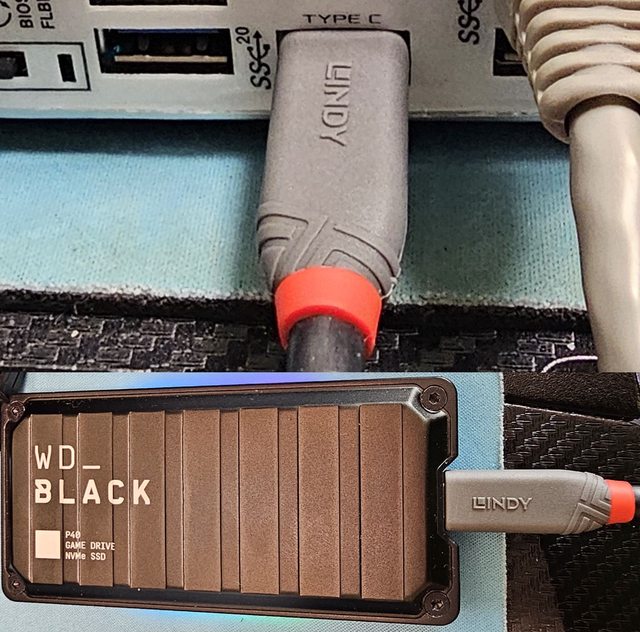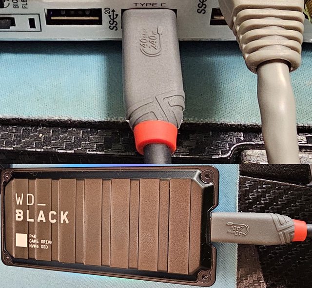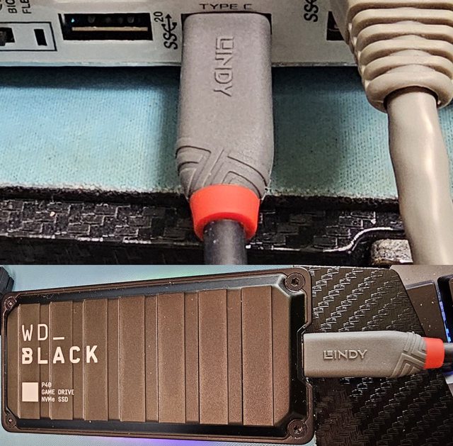 ▼2m(36958)線材一端接上主機板後方USB3.2 Gen2×2埠(上圖),另一端接上WD_BLACK