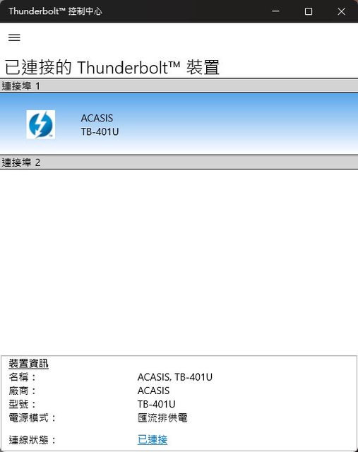 ▼Thunderbolt控制中心會顯示連接埠1已連接ACASIS TB-401U