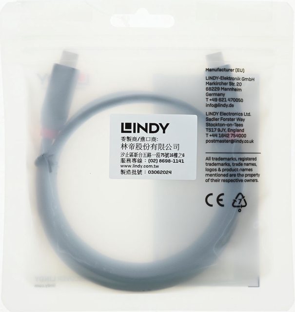 ▼兩端Type-C接頭的其中一面有LINDY商標,另一面有40Gbps 240W標誌,接頭尺寸34.3×