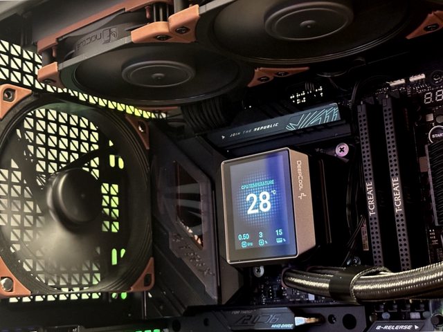 另外也順便測試將散熱器改成九州風神 MYSTIQUE 360 帶螢幕顯示水冷搭配貓頭鷹