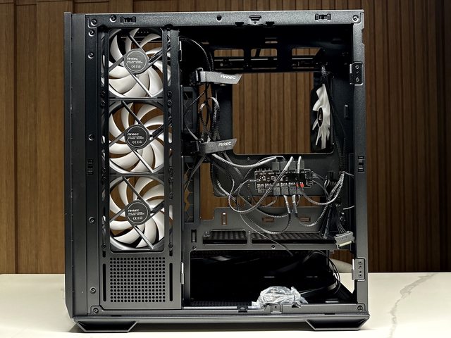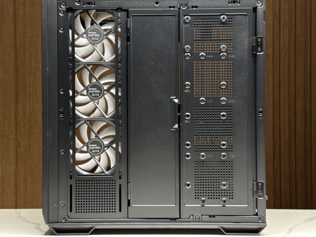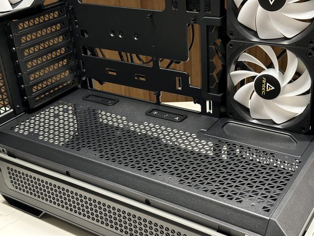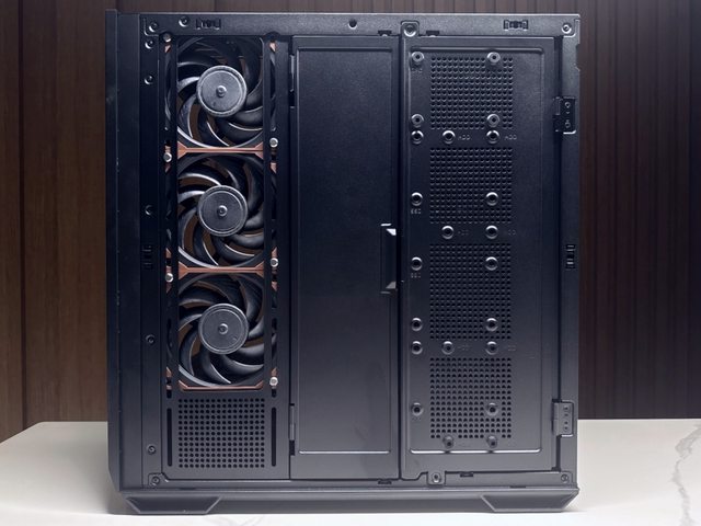 側邊3顆風扇位置支援安裝360mm水冷,只要將風扇下方檔板拆除就能騰出冷排位置。