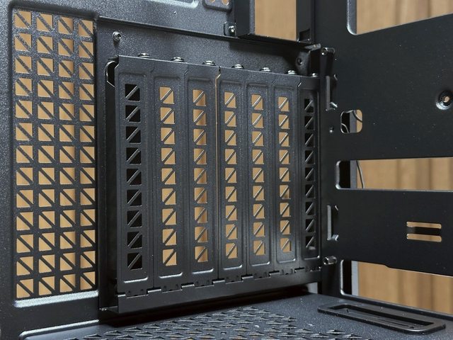 PCI-E槽設置7個可重複使用檔板,中間也無結構阻擋,甚至整片插槽可以直接旋轉成直立