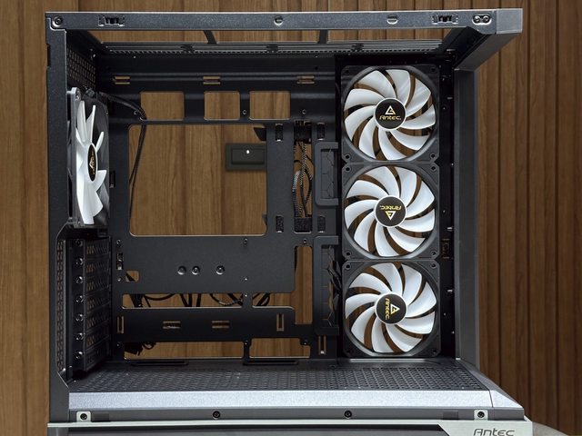 另一個可惜的點,在拆除Antec C7 ARGB側邊風扇底部檔板前,3顆120mm風扇的安裝位置
