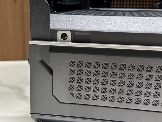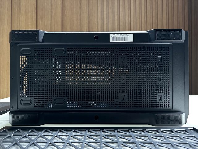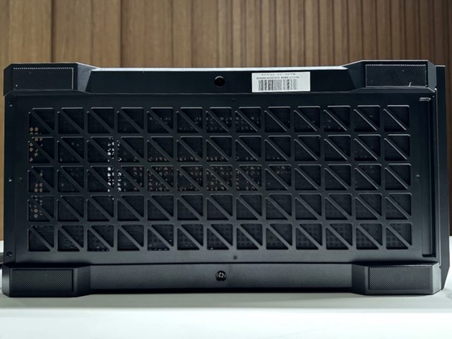 背面設有兩條長形開孔,前方為3顆風扇進氣用,後方則作為硬碟被動散熱使用。因為開