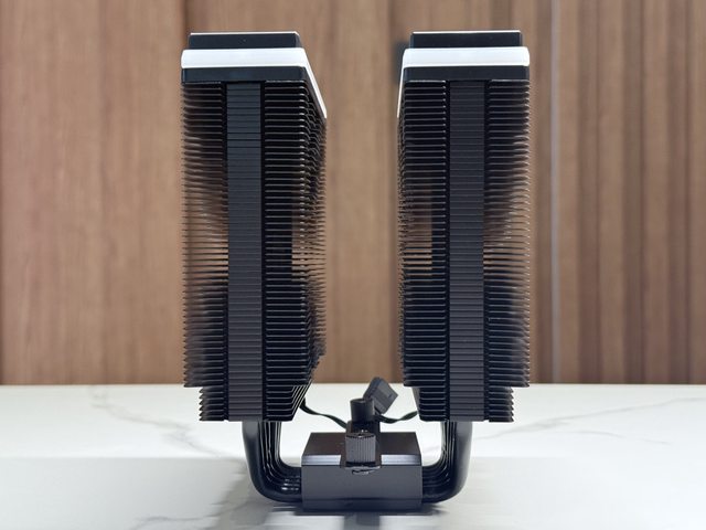 採用全對稱雙塔結構,單邊厚度約56mm,側邊使用彎折設計以保持鰭片間距。
