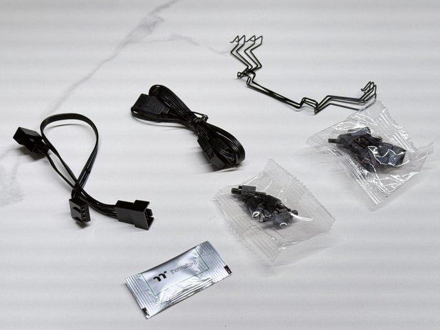 其他配件則有風扇及燈效分接線各1、兩副風扇鋼絲扣具、螺絲及一小包散熱膏。