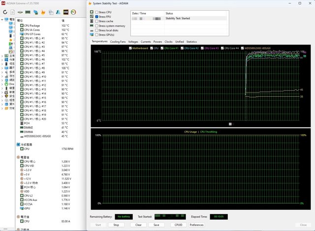 Package溫度為102度,P核心平均溫度為97.25度,核心電壓顯示為1.208V。