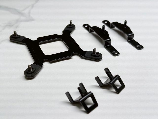 散熱器扣具全為金屬材質,INTEL CPU需搭配方正背板,AMD CPU則使用內建扣具。