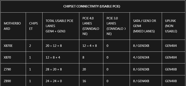 Z890 晶片組改變不大,主要是把 GEN3 通通升級為 GEN4,但總 PCI-E 可用通道由 28 降