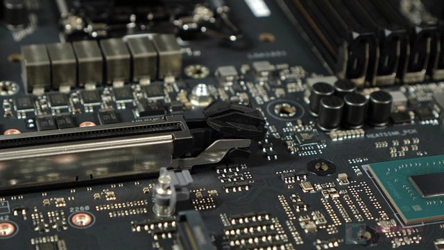 ROG 的 M.2 散熱的設計不走鰭片或多凹槽的設計,尾部銀色的拉環除了有鎖定和解除散熱