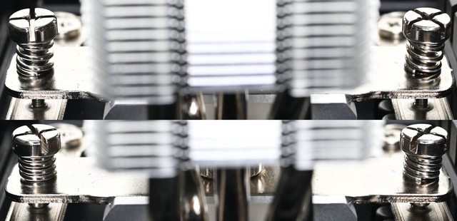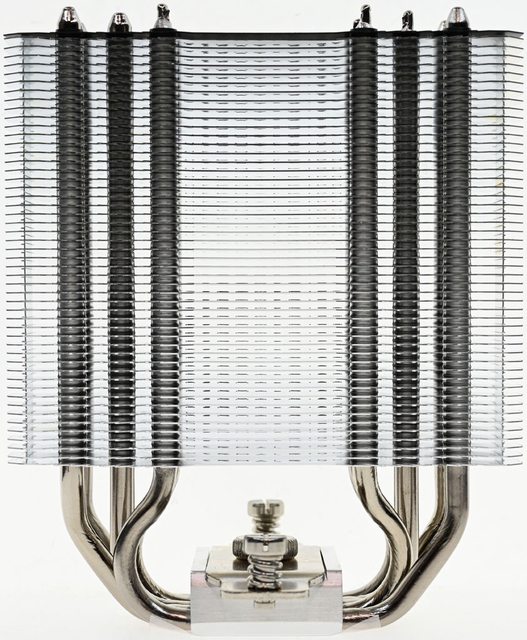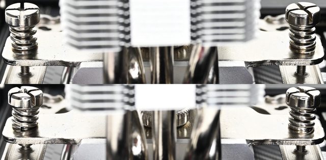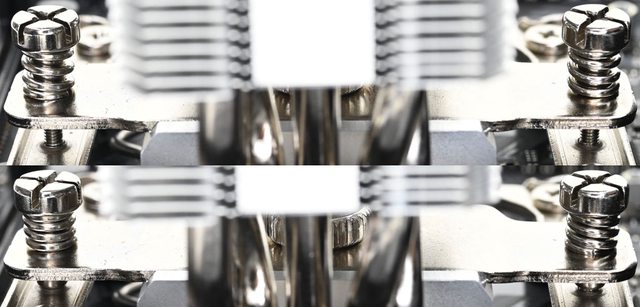 ▼從側面看,壓板兩邊設置鎖在托架上的彈簧螺帽,壓板中間用1個手轉螺絲固定在散熱