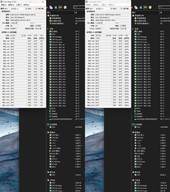 ▼功耗限制200W下待機(左)及高負載(右)的CORE TEMP及AIDA64感測器畫面