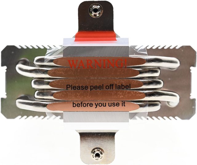 ▼散熱器底座的處理器接觸面有保護貼,上面用英文標示"警告!使用前請撕除保護貼"